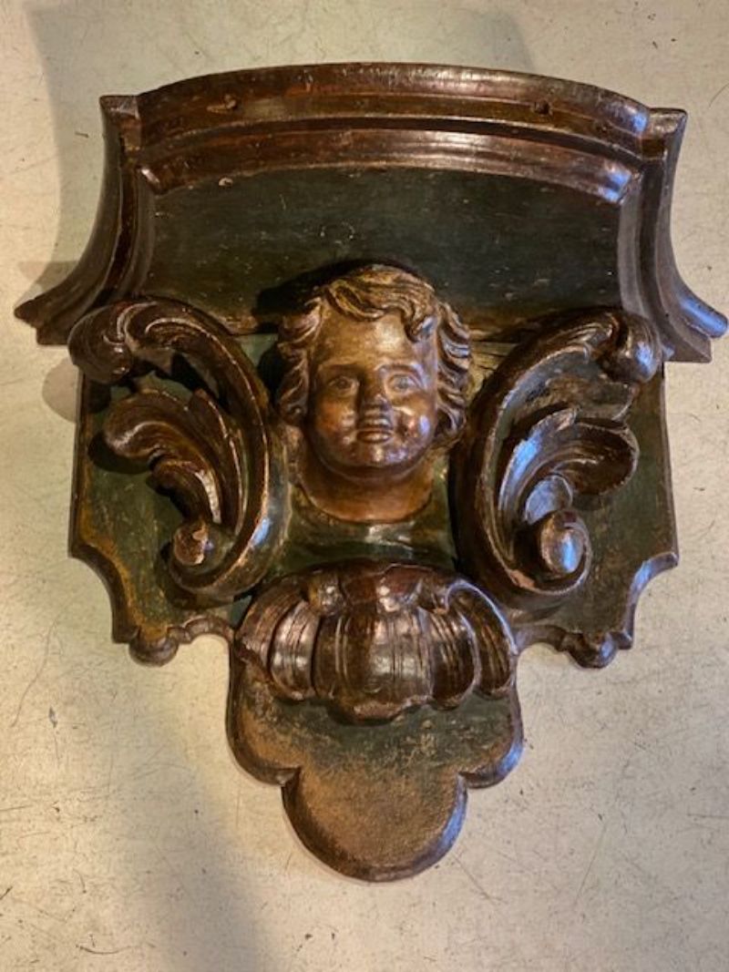 Console met engelenhoofdje. Spanje 17e/18e eeuw. Gepolychromeerd. H x B = 50 x 60 cm. Console met engelenhoofdje. Spanje 17e/18e eeuw. Gepolychromeerd. H x B = 50 x 60 cm. -