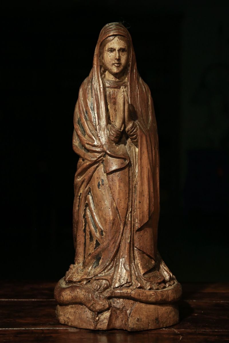 Immaculada met slang 17e eeuw notenhout. 54 cm. houten heiligbeeld met nog een paar sporen van de oude verf. Lindehout. Duitsland? Immaculada met slang 17e eeuw notenhout. 54 cm. houten heiligbeeld met nog een paar sporen van de oude verf. Lindehout. Duitsland? -
